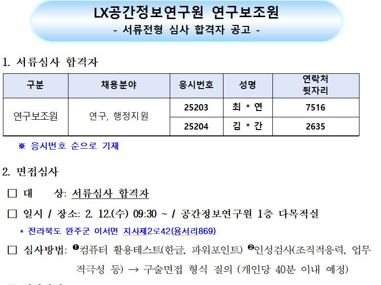 LX공간정보연구원 연구보조원(장애) 채용 서류심사 합격자 공고